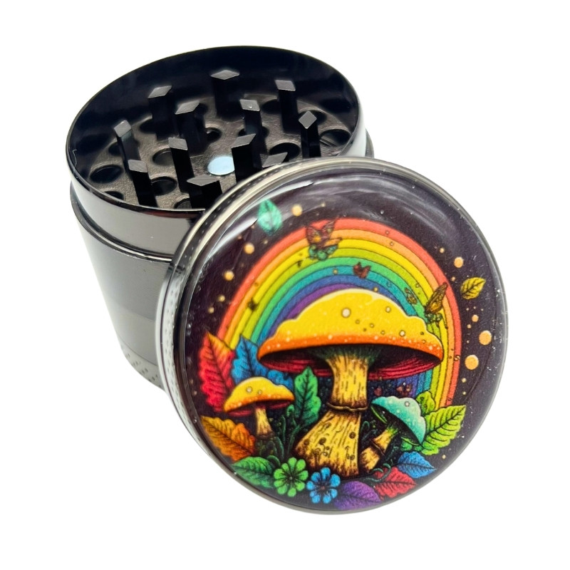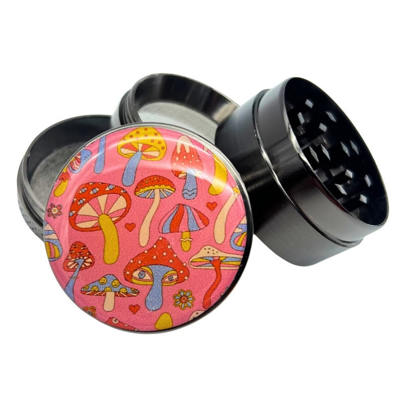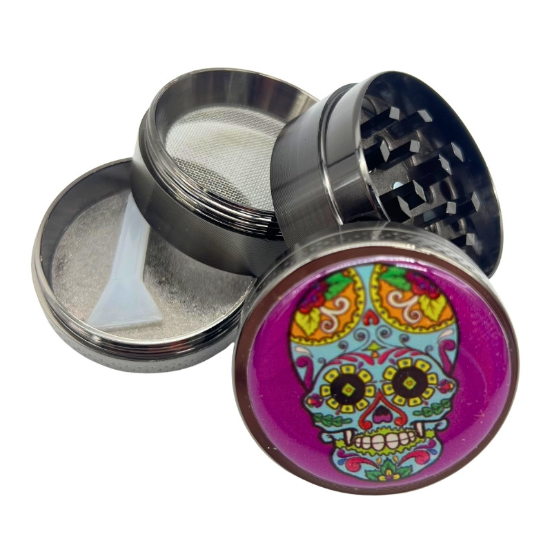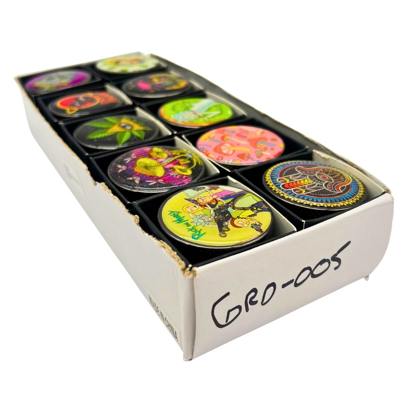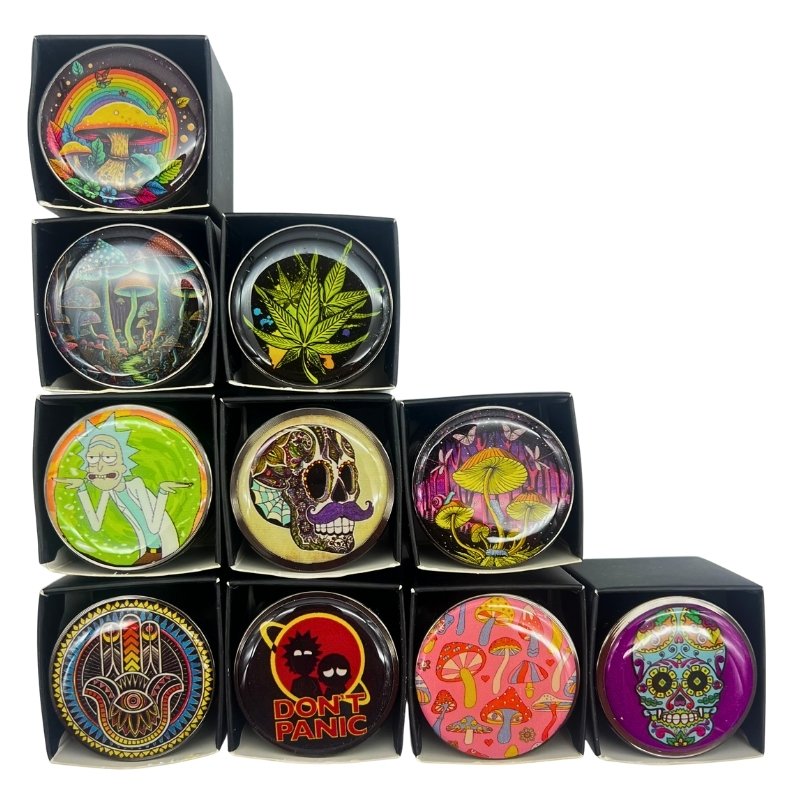 Box of 10 4-piece metal herb grinders Widely assorted illustrations Completely random assortment in each box Photos give only a general idea of the assortment
