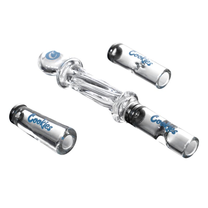This pocket-sized Cookies pipe packs a punch! This 3-in-1 device uses interchangeable magnetic tips with an iconic twist in the chamber for a cooling effect. Includes a magnetic tip to roll joints or blunts, a glass cone tip to fit pre-rolls in, and a chillum to pack a hit.