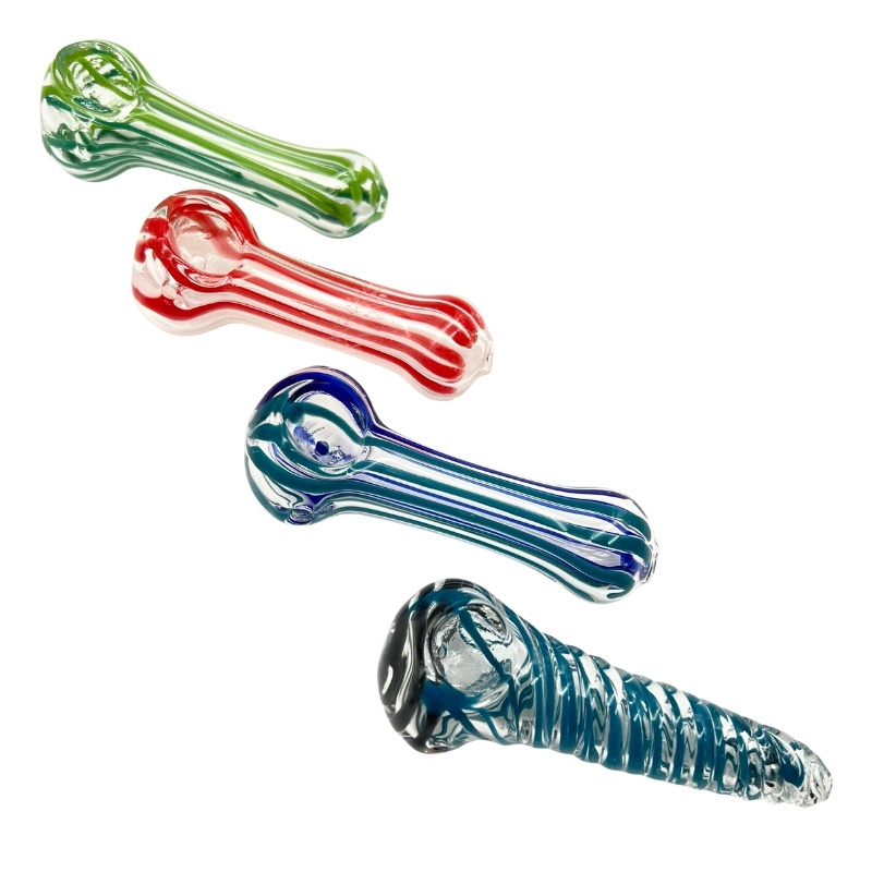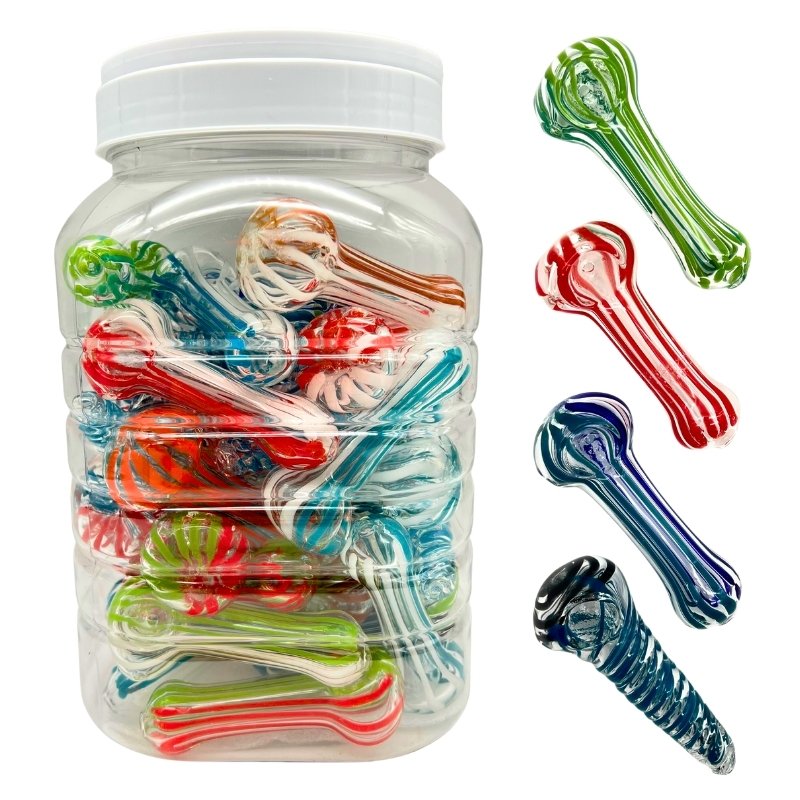 Jar of 40 glass spoon pipes Various designs and colors Measuring 3-3.5 inches Most are closer to 3.5 inches