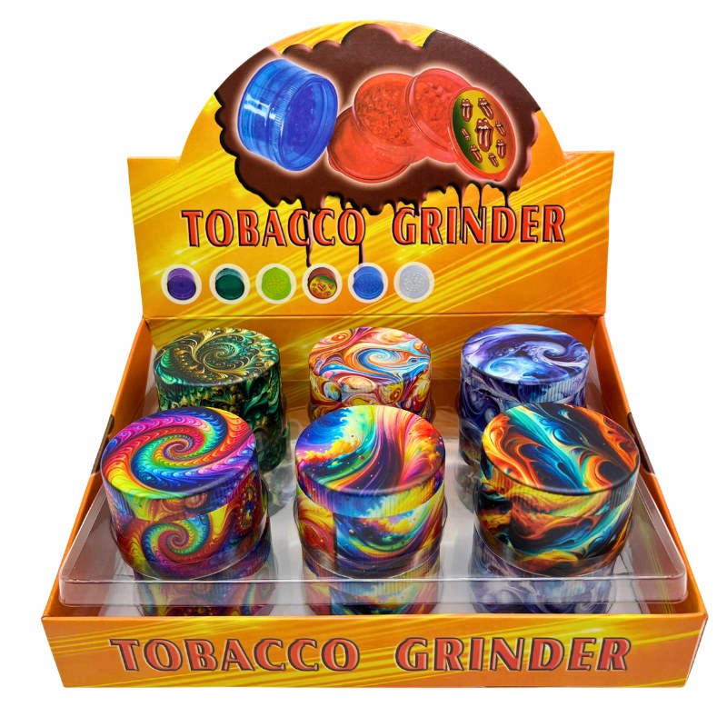 4-piece plastic grinders 44mm wide 6 designs 2 of each designs 12 grinders total
