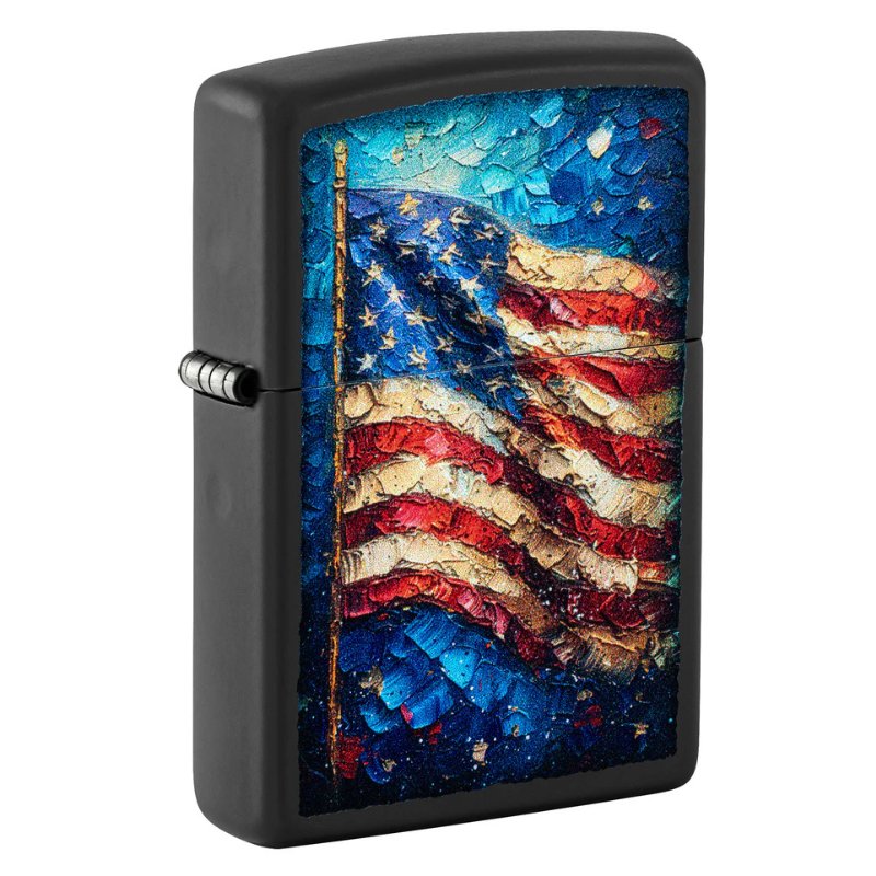 The art of palette painting, or "impasto," is beautifully replicated in the form of the American Flag on this classic Black Matte lighter in a striking Color Image design. Comes packaged in a gift box.