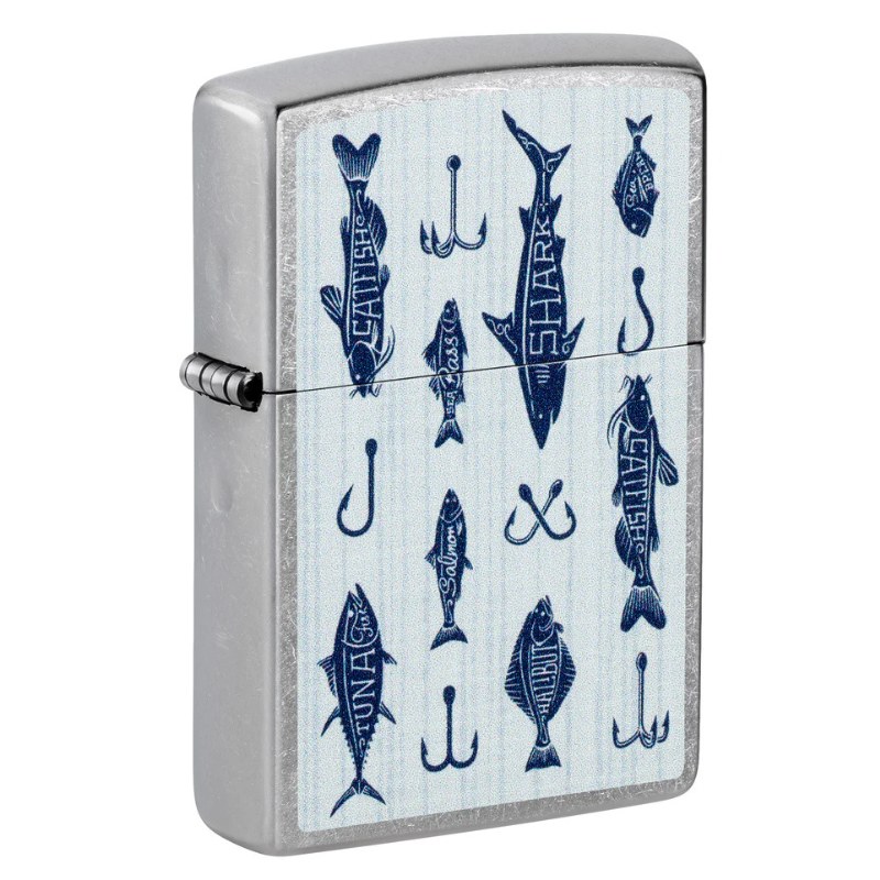 This classic Street Chrome lighter features an artful array of fishhooks and marine life in a nautical Color Image Design. Comes packaged in a gift box.