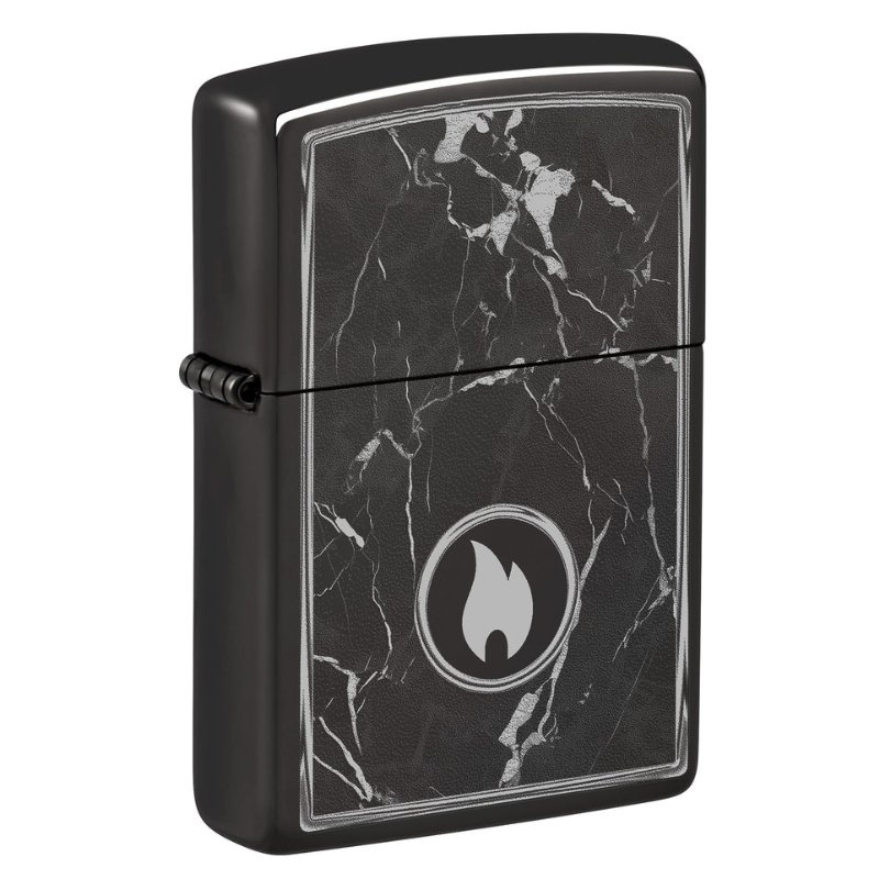 Surrounded by realistic-looking marble veining, the Zippo flame icon appears on the surface of this classic High Polish Black lighter in a mesmerizing Photo Image design. Comes packaged in a gift box.