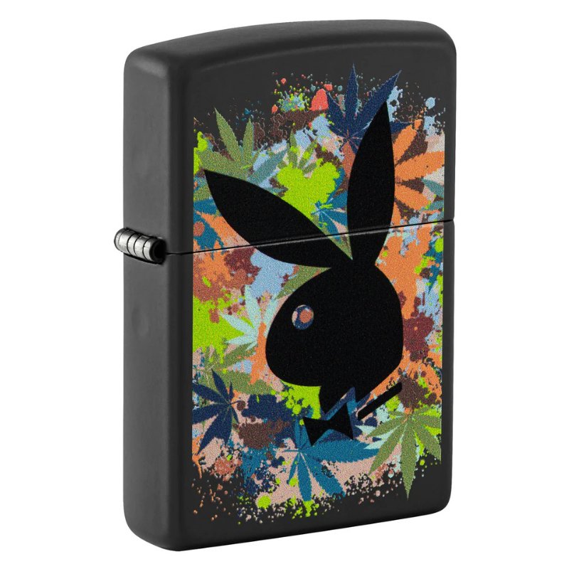 The iconic Playboy Rabbit Head Design appears in silhouette over a collage of cannabis leaves on this classic Black Matte lighter in a bold Color Image design. Comes packaged in a gift box.