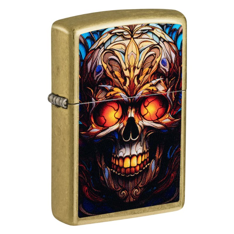 Resembling ornate, glowing stained glass, a grinning skull commands the surface of this classic Street Brass lighter in a vibrant Color Image design. Comes packaged in a gift box.